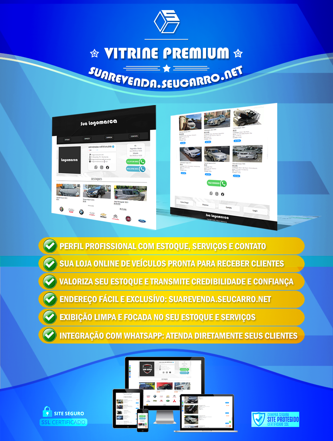 A Vitrine Premium é mais do que uma loja digital para sua Revenda. Ela é o seu espaço exclusivo na internet, construído para mostrar seu estoque com clareza, transmitir confiança e gerar contato direto com os interessados.